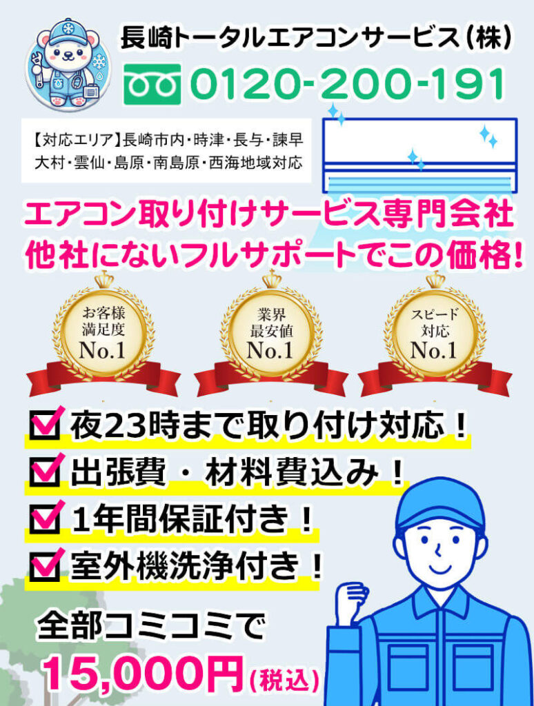大切なエアコンを最適な状態でお使いいただけるようにするのはもちろん、電気代を抑えて長く使っていただけるように、今ならエアコン取り付けコミコミパックをお申し込みの方全員に「保守メンテナンス」を一年間サービス!他社には無い、取り付けから一年後に室外機の洗浄を無料でお約束いたします。